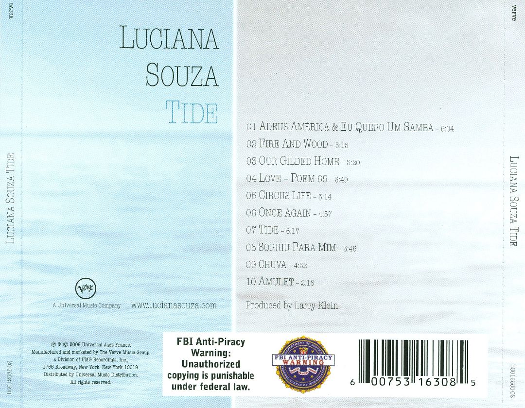 Luciana Souza's second project with producer Larry Klein for the Verve label is a more authentic, Brazilian-based project than her previous tribute to Joni Mitchell, and showcases further why this vocalist is one of the true original voices in contemporary music. Keyboardist Larry Goldings, drummer Vinnie Colaiuta, guitarists Larry Koonse or Romero Lubambo, percussionist Cyro Baptista, and Klein on electric bass guitar offer musicality that is grand but not grandiose. On this recording, Souza sings lyrics in English or Portuguese that speak about heartfelt realms of home and togetherness with nature, in co-opted assistance with Klein, David Batteau, and in works adapted from e.e. cummings. At her best, the wise and wistful Souza sings the song of belonging "Our Gilded Home," and the slow, spirit/soul tune "Once Again" with all the patience and virtue of an angel/saint. On the other side, she is able to inject excitement and energy in equal proportions during the pure, bouncy, sharp-edged, popping "Adeus America/Eu Quero Um Samba," and the jumping out of her skin "Sorriu Para Mim." The most intriguing selection applicable to modern times is "Circus Life," an incredible, extended treatise on the constant, unexpected ups and downs of the world, with an emphasis lyric "the cure is worse than the disease" among many others -- listen closely to this one. "Fire & Wood" sports the heaviest beat from Klein and a retro sound via Goldings, whereas the opposite "Chuva" is pure and light tropicalia, a yearning song at sunset. The title track, "Tide," is more a tide pool left after a beach wash down, with Goldings and Koonse's slow 4/4 lines ebbing and flowing. Where Lubambo is a jam master urging the vocalist to ride on his cameos, Koonse throughout inspires Souza to soar, while Goldings creates magic whether playing organ, acoustic piano, or Fender Rhodes -- he is the straw that stirs this oceanic drink. Thankfully, this is not an overtly commercialized effort, which suits Souza's natural gifts, and comes easily recommended along with her earlier works. Michael G. Nastos Tracklist + Credits :